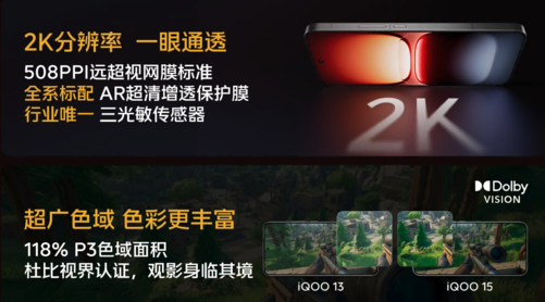 iQOO15的画面表现能有这么出色,性能和调校是一方面,另一方面需要有一块好的屏幕才能最大程度发挥出优势。iQOO15全球首发2KLEAD三星珠峰屏,搭载了最新发光材料M14。