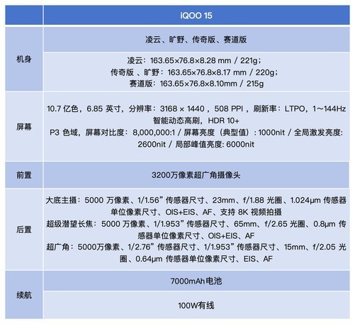 开头咱们还是先用一张图看懂iQOO15的硬件配置~